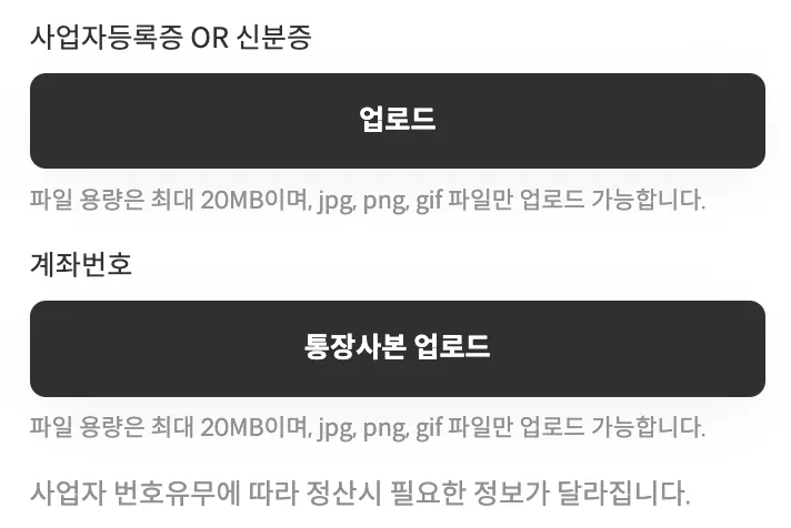 사업자등록증 OR 신분증 [업로드] 버튼을 클릭 후 업로드해주세요
