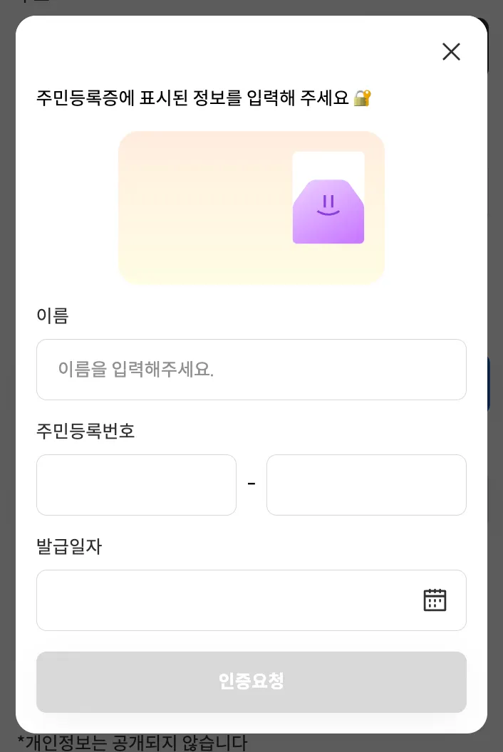 다음과 같은 팝업이 나타나면 주민등록증에 표시된 정보를 입력해주세요
