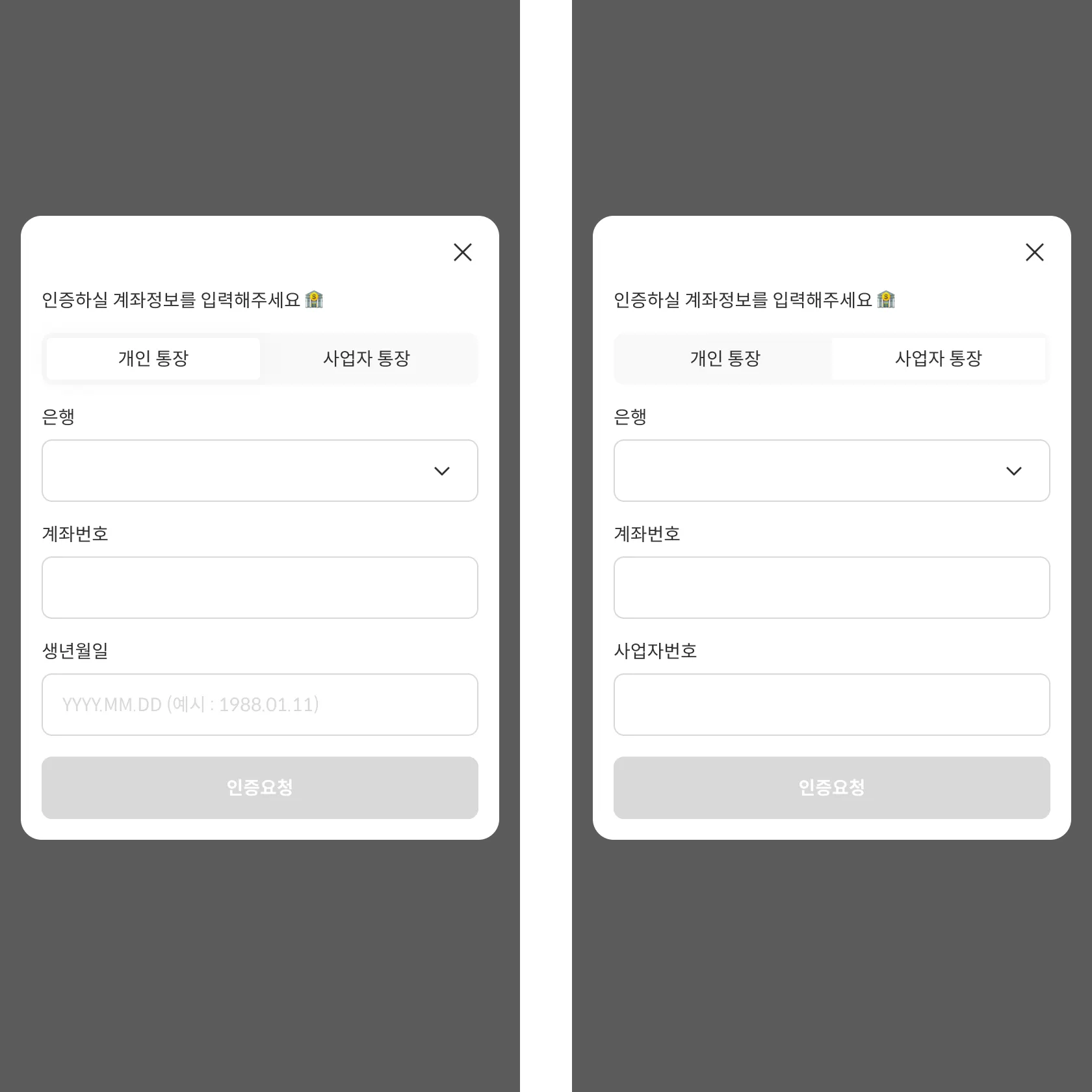 개인통장 / 사업자통장 중 선택하여 계좌정보를 입력하고 인증요청을 진행해주세요