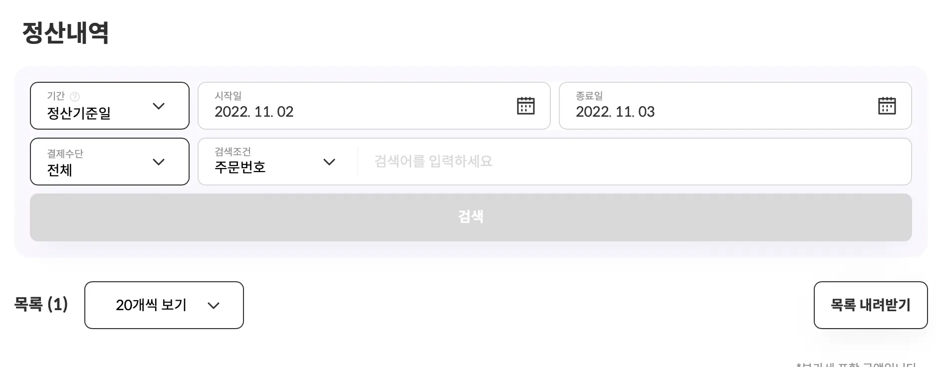 결제된 모든 주문들의 정산상태 및 정산정보를 확인하실 수 있는 페이지입니다.