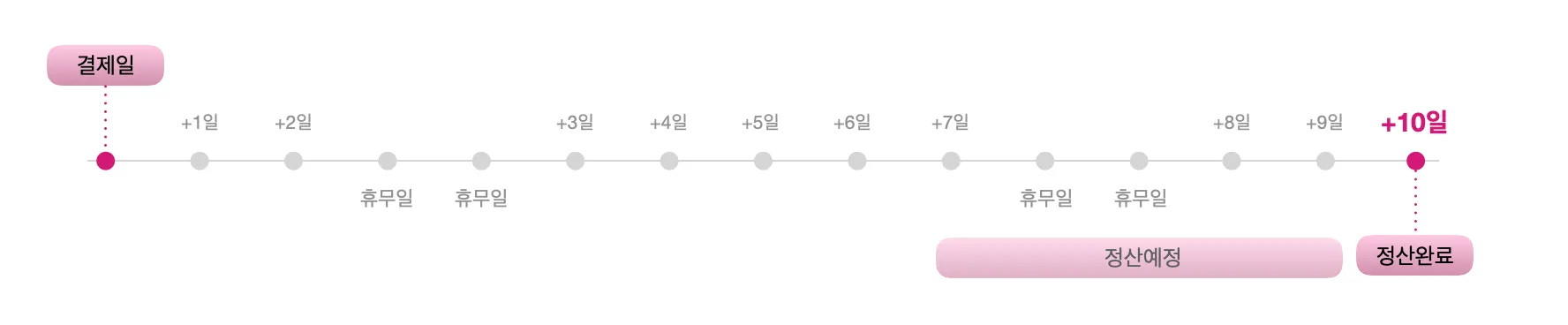 별도 신청 없이 결제일 이후 10영업일째 되는 평일에 지정된 계좌로 결제 수수료를 제외한 금액이 자동으로 정산 입금됩니다.