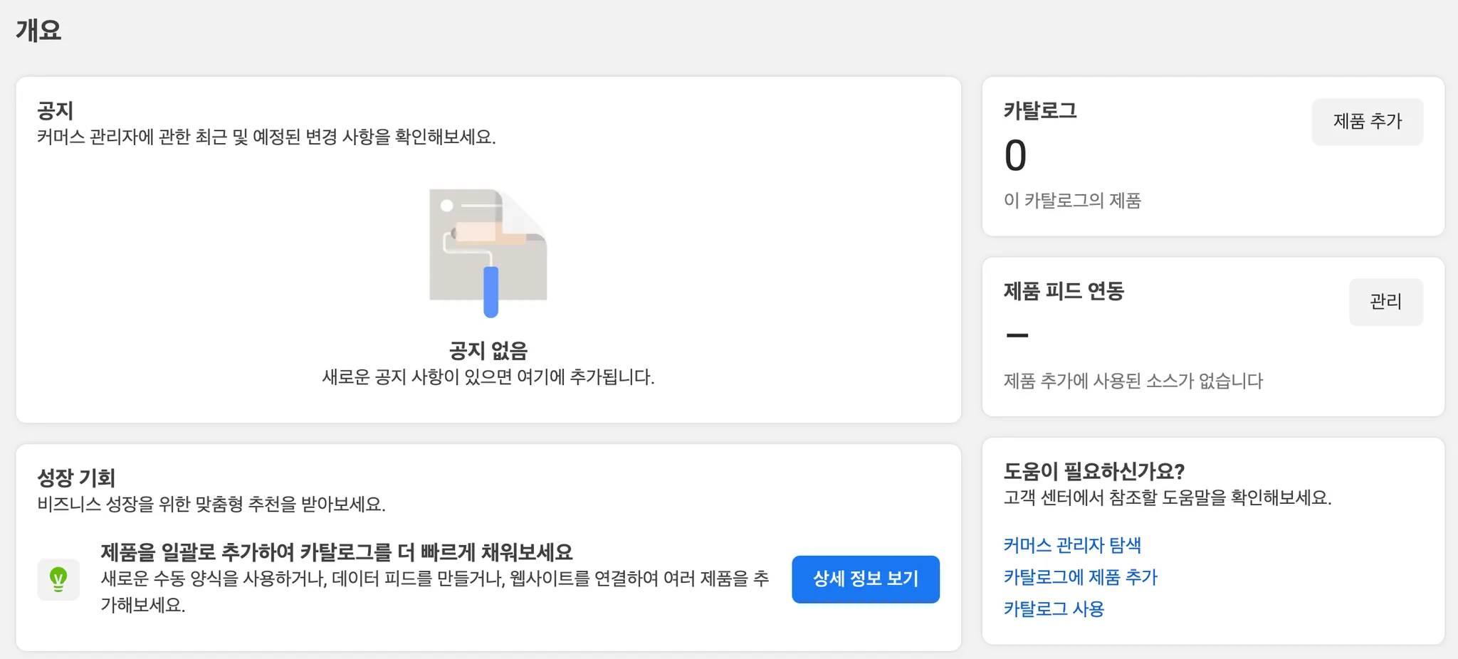 페이스북(현 메타) 비즈니스 계정에서 [커머스관리자] 탭으로 들어가세요.