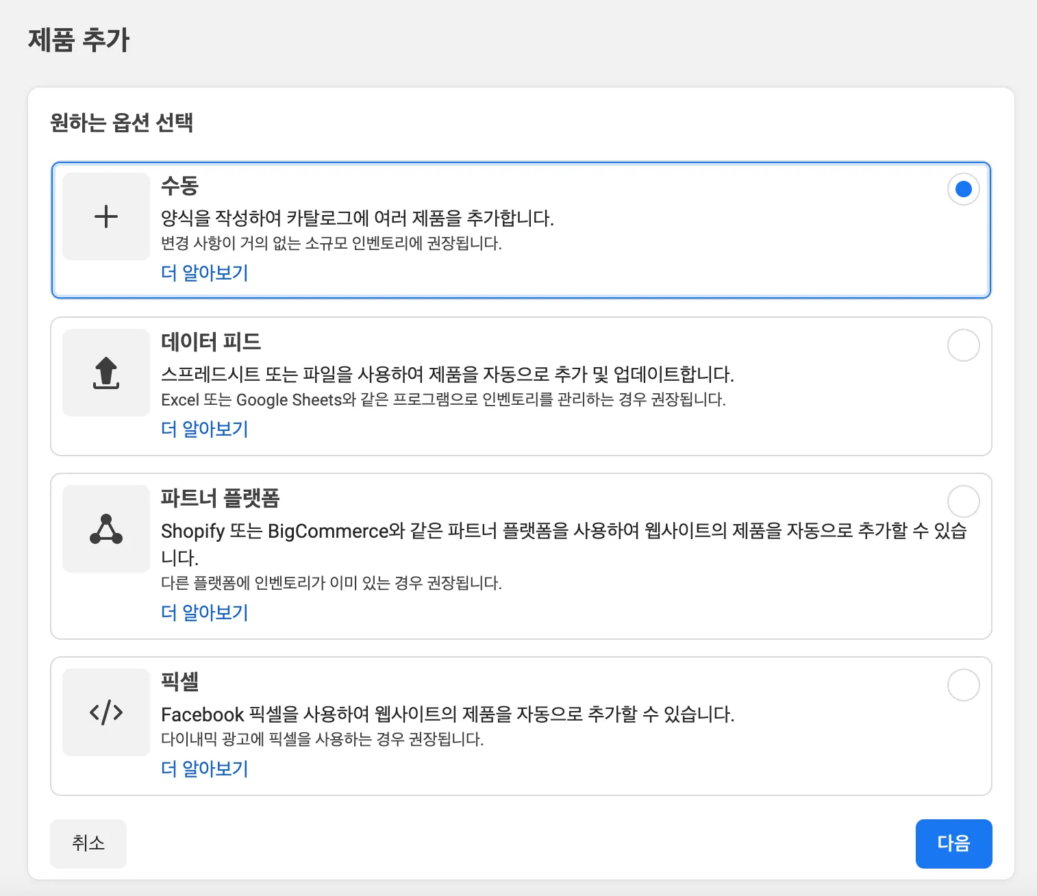 수동/데이터 피드 중 편하신 방법을 선택해주세요.