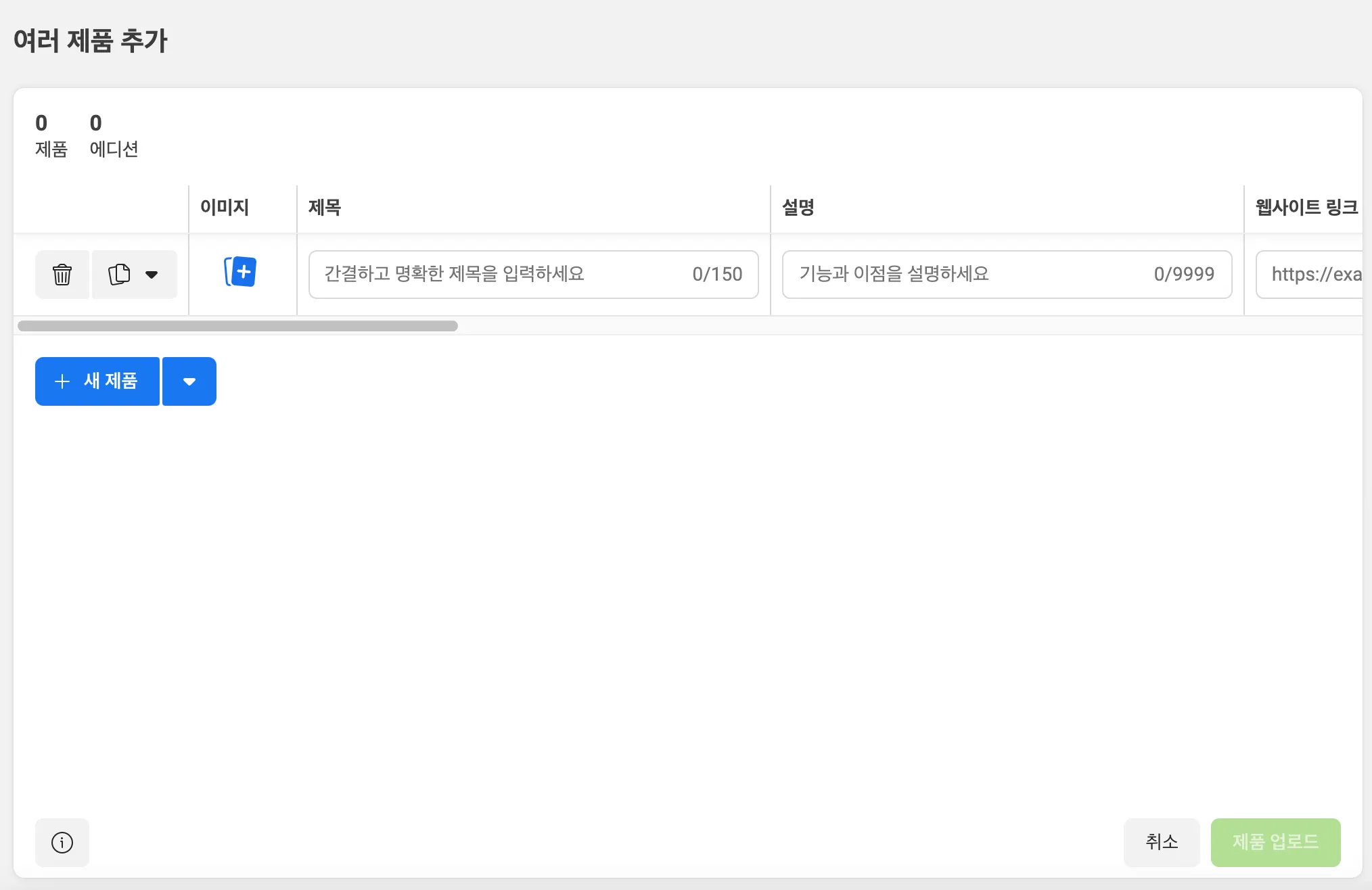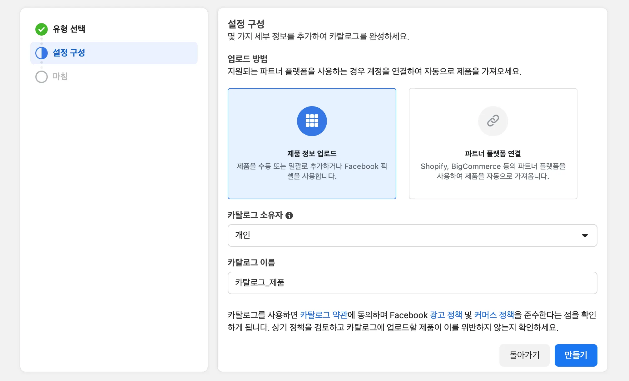 업로드 방법을 [제품 정보 업로드]로 선택해주세요. 이후 카탈로그 소유자를 선택하시고, 카탈로그 이름을 정해주세요.